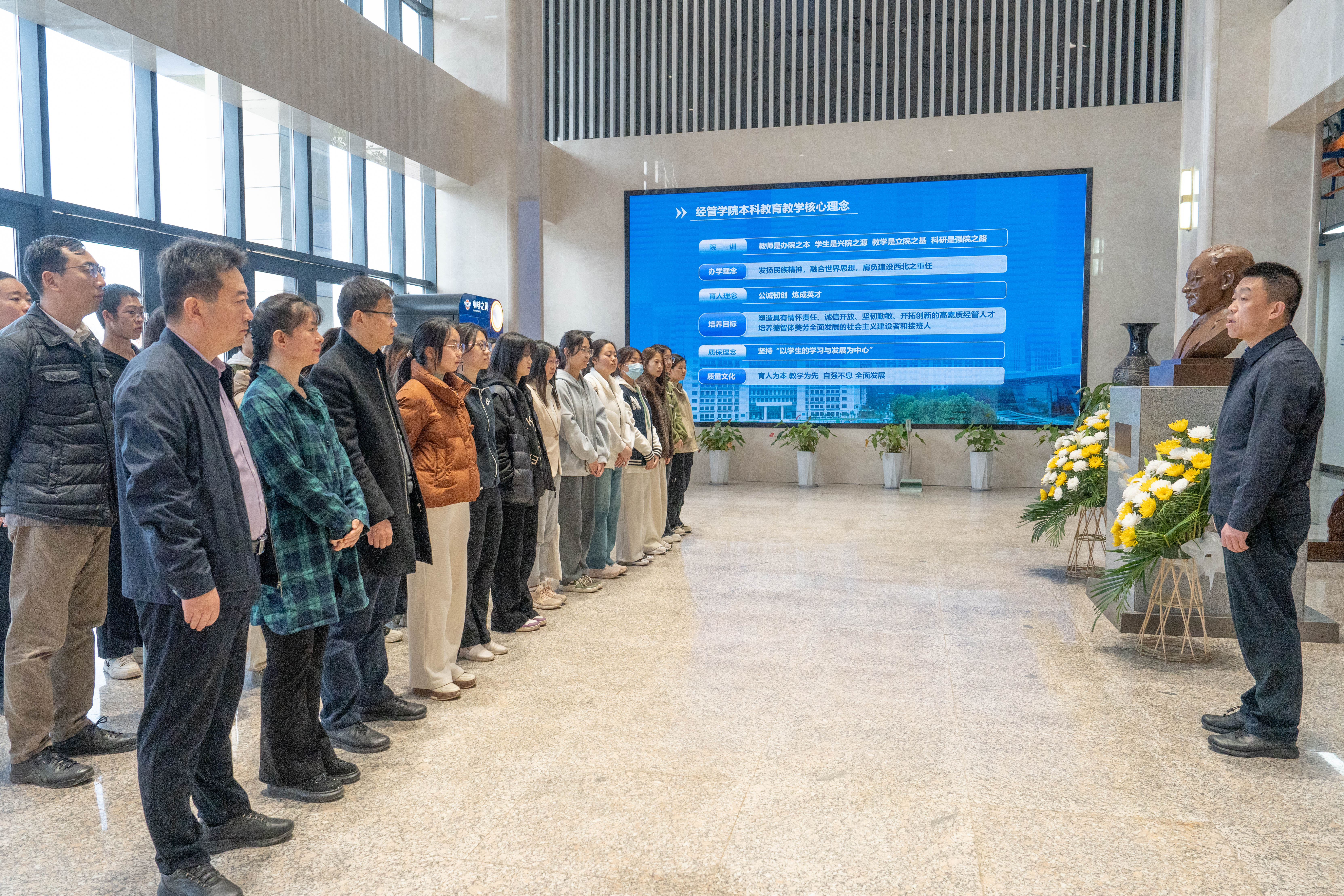 首先,师生们在宏观经济大楼一层大厅何炼成先生塑像前集合,敬献花篮。