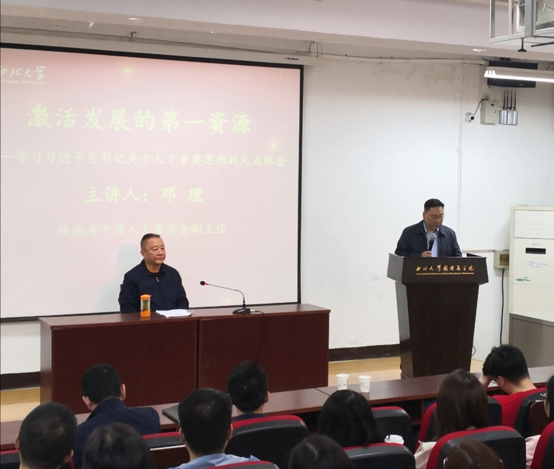 杜勇主持活动时代表学院对邓理副主任来院讲座表示热烈欢迎。他说,全党正在开展“不忘初心,牢记使命”主题教育,希望每一位同学把本次报告作为学习习近平总书记人才思想的一次导读,深刻理解人才是第一资源的深刻含义,把自己和国家的命运紧紧结合在一起,找准个人定位,树立“人人皆可成才、人人尽展其才”的理念,为实现中华民族的伟大复兴做出自己的贡献。