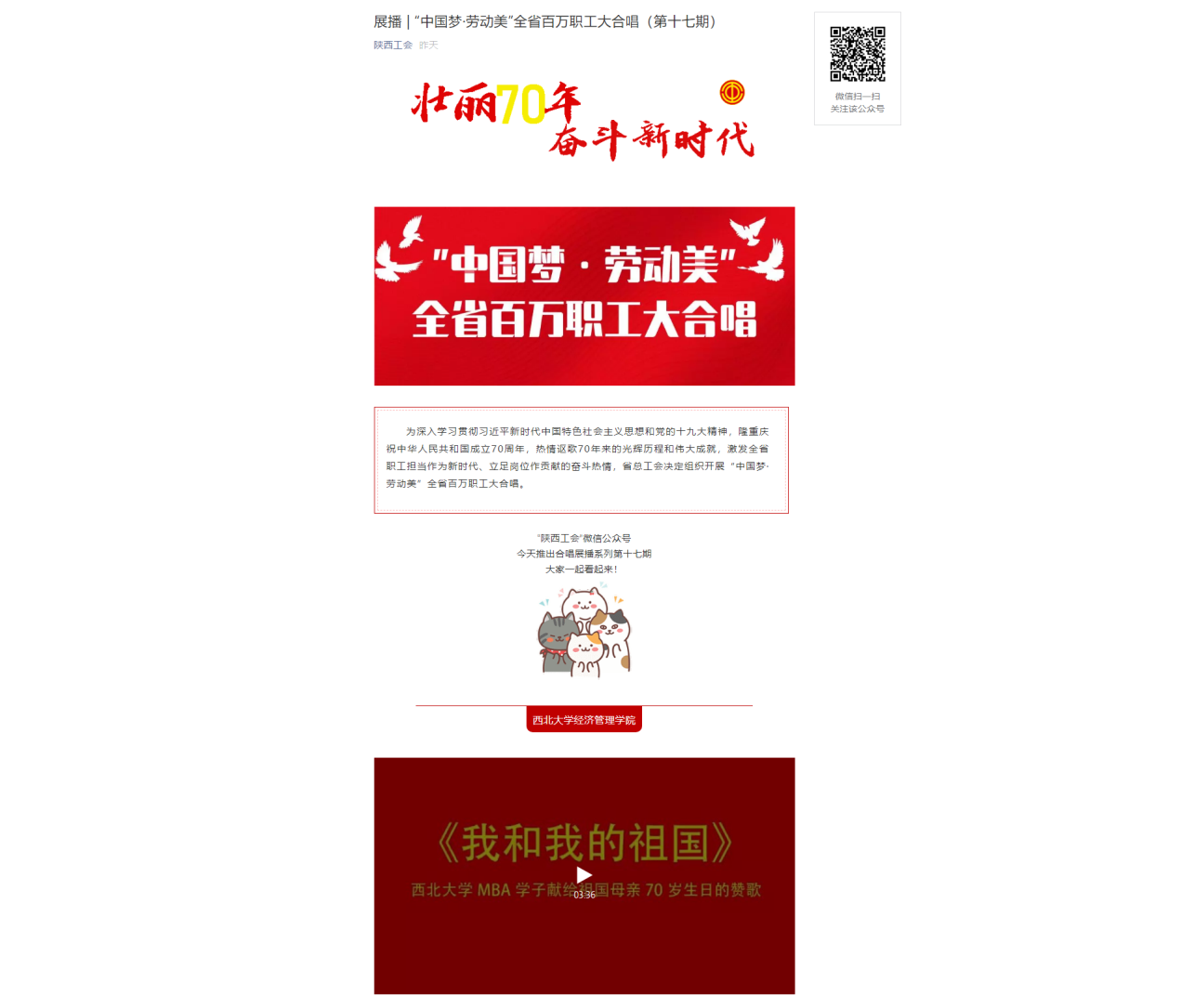 金秋气爽,丹桂飘香。2019年9月21日我院MBA学员唱响《我和我的祖国》,致敬我们伟大的祖国,献礼祖国70华诞。视频在陕西省总工会举办的“中国梦﹒劳动美”百万职工大合唱活动中展播。