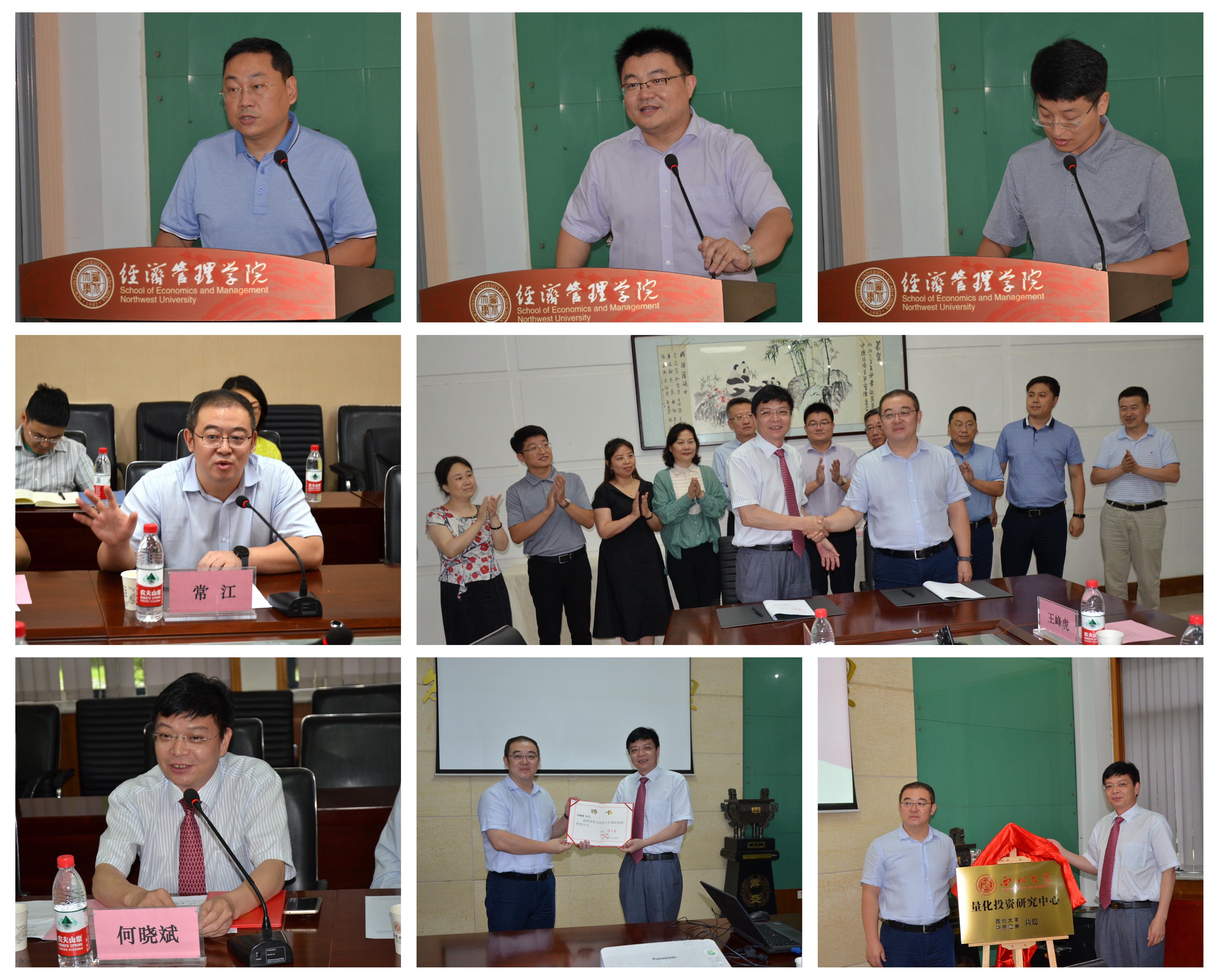 经管院吴振磊院长首先致欢迎辞,他对华鑫证券有限公司与我院开展产学研合作表示感谢。华鑫证券西安分公司金融科技负责人辛鑫介绍了产学研合作协议内容,常江副校长和华鑫证券首席经济学家何晓斌博士代表双方签约,并共同为西北大学量化投资研究中心揭牌,常江副校长向何晓斌博士颁发了西北大学兼职教授聘书。随后,华鑫证券首席经济学家何晓斌博士和常江副校长分别就如何落实产学研战略合作协议发表了讲话,双方一致认为要加大投入,认真落实协议,早出成果,构建互利共赢的长效合作机制。华鑫证券西安分公司联席总经理邱毅华、科技路营业部总经理孙俊萍、西北大学国内合作与校友工作处处长崔延力及金融系教师代表共同见证了签约仪式,并合影留念。