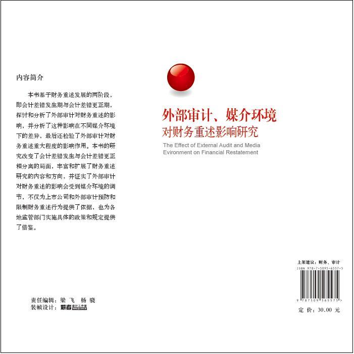 该书基于财务重述发展的两阶段,即会计差错发生期与会计差错更正期,探讨和分析了外部审计对财务重述的影响,并分析了这种影响在不同媒介环境下的差异,最后还检验了外部审计对财务重述重大程度的影响作用。该书的研究改变了会计差错发生与会计差错更正相分离的局面,丰富和扩展了财务重述研究的内容和方向,并证实了外部审计对财务重述的影响会受到媒介环境的调节,不仅为上市公司和外部审计预防和限制财务重述行为提供了依据,也为各地监管部门实施具体的政策和规定提供了借鉴。