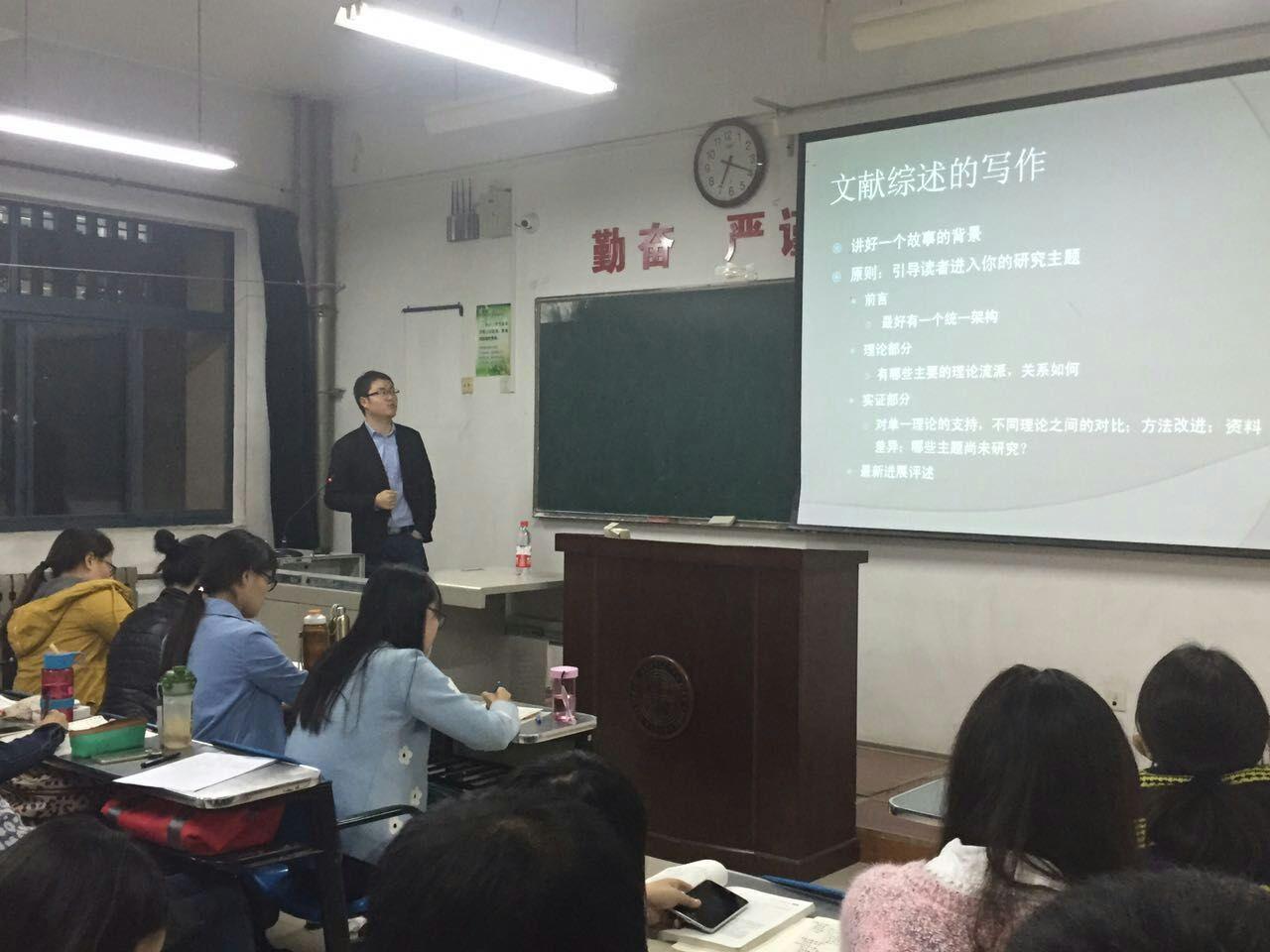 10月28日研究生学术月讲座第六讲在长安校区1210教室举行。刘瑞明副教授应邀做题为《困扰我们已久的论文写作:一些经验和教训》的报告。刘瑞明副教授首先讲了为什么要做论文,他指出,要理清现在所处的位置,认清做论文的三个层次。接下来他给大家详细讲解了现代论文的写作格式以及具体论文选题的方式、阅读文献的方法和建模的步骤。他还大量加入自己写作和审稿相关经历,使整个论坛生动而富有吸引力。