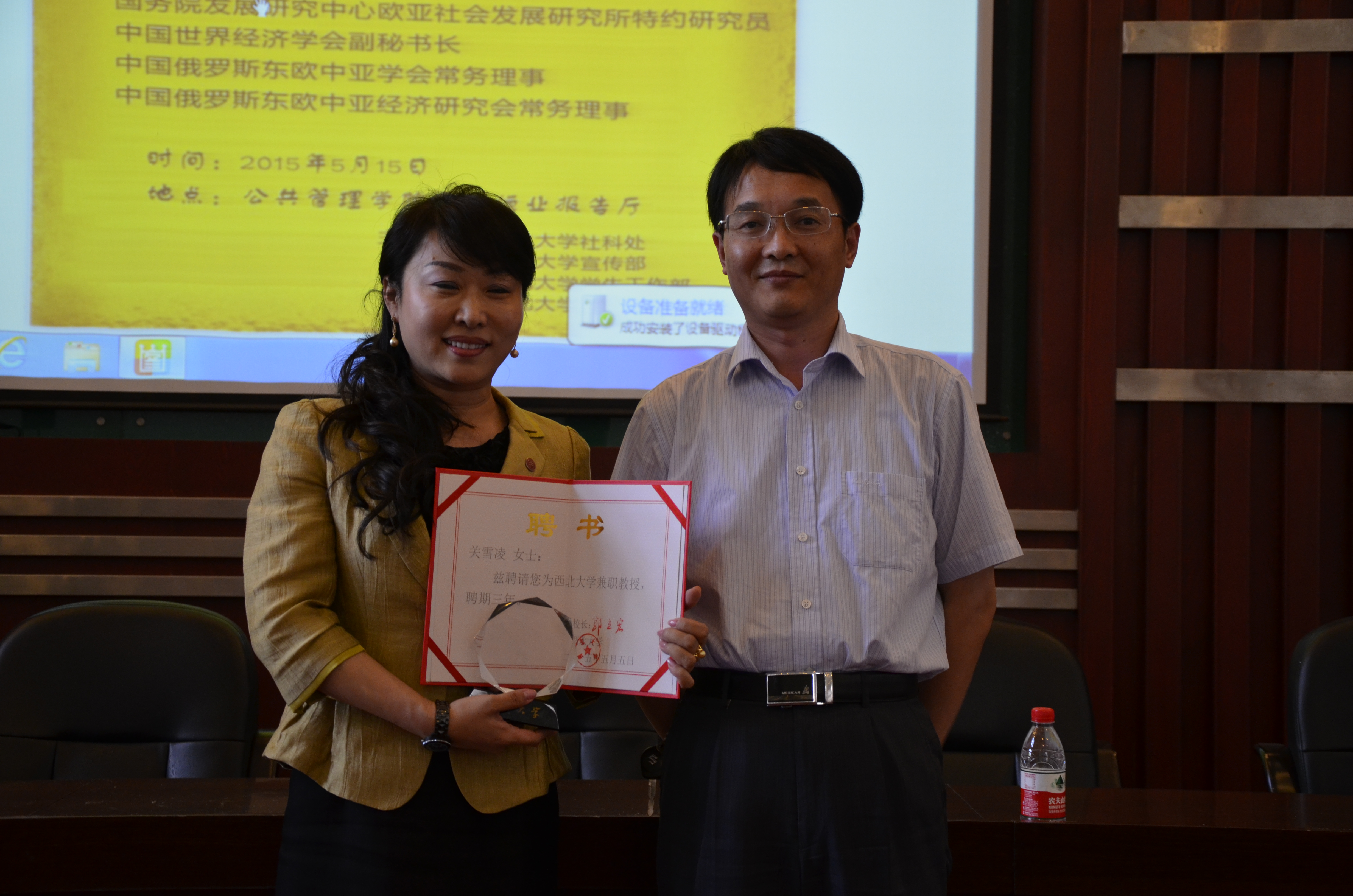 在学术报告开始前,任保平教授对关雪凌教授的研究方向和学术成就做了简要介绍,我校人事处负责人为关雪凌教授颁发了兼职教授聘书。关教授对受聘我校致以真诚感谢,表示将认真尽好一名兼职教授的职责,希望有更多的机会与我校展开多层面的学术交流。