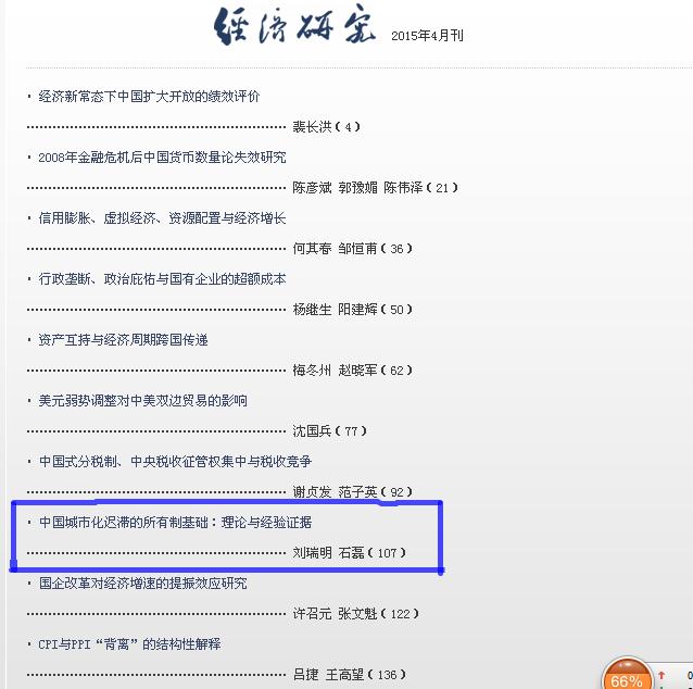 近日,我院经济学系副主任刘瑞明副教授以第一作者身份在权威期刊《经济研究》2015年第4期发表了文章《中国城市化迟滞的所有制基础:理论与经验证据》,全文约2万余字。