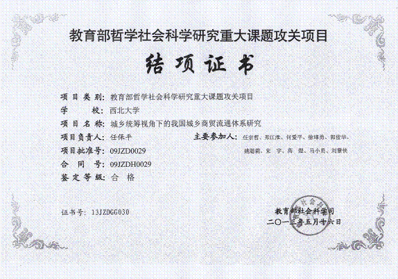 以我院院长任保平教授为首席专家获得的教育部重大攻关项目《城乡统筹视角下城乡商贸流通体系研究》近日顺利结题,教育部社科司颁发了结题证书。
