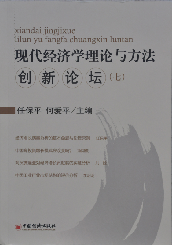 2011年6月,《现代经济学理论与方法创新论坛》第七辑由中国经济出版社正式出版。《现代经济理论与方法创新论坛(七)》是以我院经济学系、西北大学国家理论经济学基础人才培养基地主办的“现代经济学理论与方法创新论坛”讲稿为主体的一本论文集,由任保平教授、何爱平教授担任主编,范王榜副教授、宋宇教授和高煜副教授担任副主编。