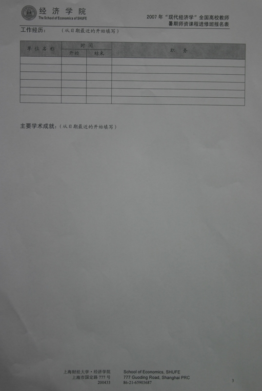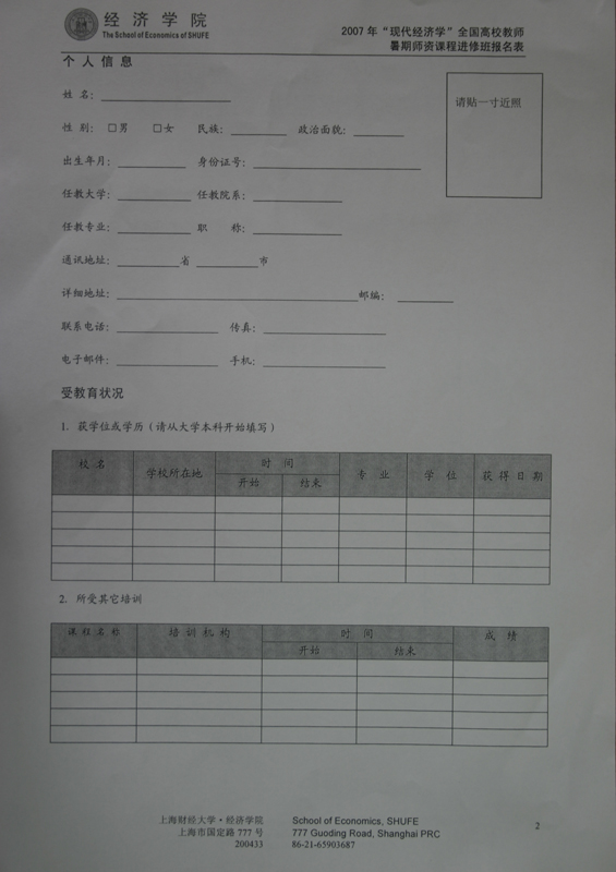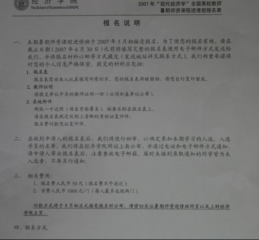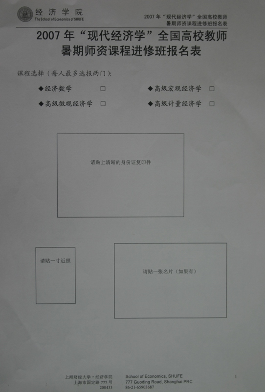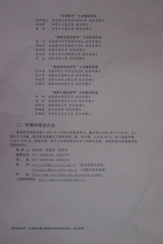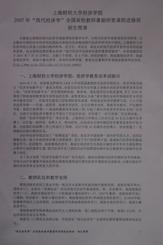 上海财经大学经济学院2007年“现代经济学”全国高校教师暑期师资课程进修班招生