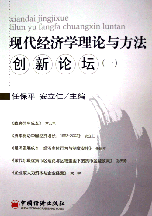 《现代经济理论与方法创新论坛(一)》是以我院经济学系、西北大学国家经济学基础人才培养基地和经济增长与计量研究所主办的“现代经济理论与方法创新论坛”讲稿为主体的一本论文集,由任保平教授、安立仁教授担任主编。该论坛以理论创新和方法创新为主体,重在普及和推广现代经济学的研究方法,培养学生的理论研究兴趣。该论坛举办一年多来,在学生与教师中产生了重要影响,论文被引用、转载的次数不断增多。第五届中国经济学年会收录我校6篇论文,其中4篇出自该论坛。该书为该论坛出版的第一本文集,收录有我校及全国著名学者的文章,文章质量较高,研究方法规范,既推广了现代经济理论与方法,又提高了我校经济学研究的科学化与规范化。