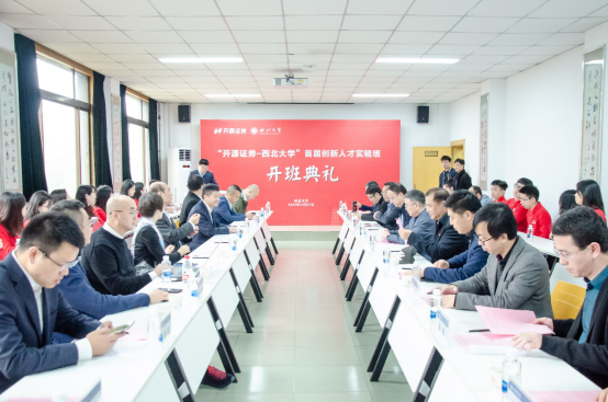 10月27日上午,“开源证券-西北大学”首届创新人才实验班在我校太白校区776net必赢官网正式开班。原全国社保基金理事会副理事长、陕西宏观经济研究院院长王忠民教授,我校校长郭立宏,校党委常委、副校长王尧宇,中国证监会发言人高莉,开源证券董事长李刚,朱雀投资董事长李华轮,中国小额贷款公司协会党委委员、秘书长樊卫东,宁夏嘉川集团董事长马小奇,开源证券副总经理武怀良、总经理助理张国松、人力资源部总经理李青,我校国内处处长崔延力、研工部部长李军、学工部副部长史伟、教务处副处长郭唅,学院党委书记杜勇、副院长李辉、师博、赵传仁,学院金融学系主任王满仓、副主任王峰虎和部分青年教师以及首届创新人才实验班全体学员、媒体代表等50余人参加活动。开学典礼由学院院长吴振磊主持。