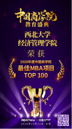 2020年12月23日,“2020中国商学院教育盛典”在北京隆重举行。我院MBA项目荣获“2020年度中国商学院最佳MBA项目TOP100”第43名,MBA/EMBA教育中心主任马晓强荣获荣获2020年度“中国商学院卓越运营奖”。
