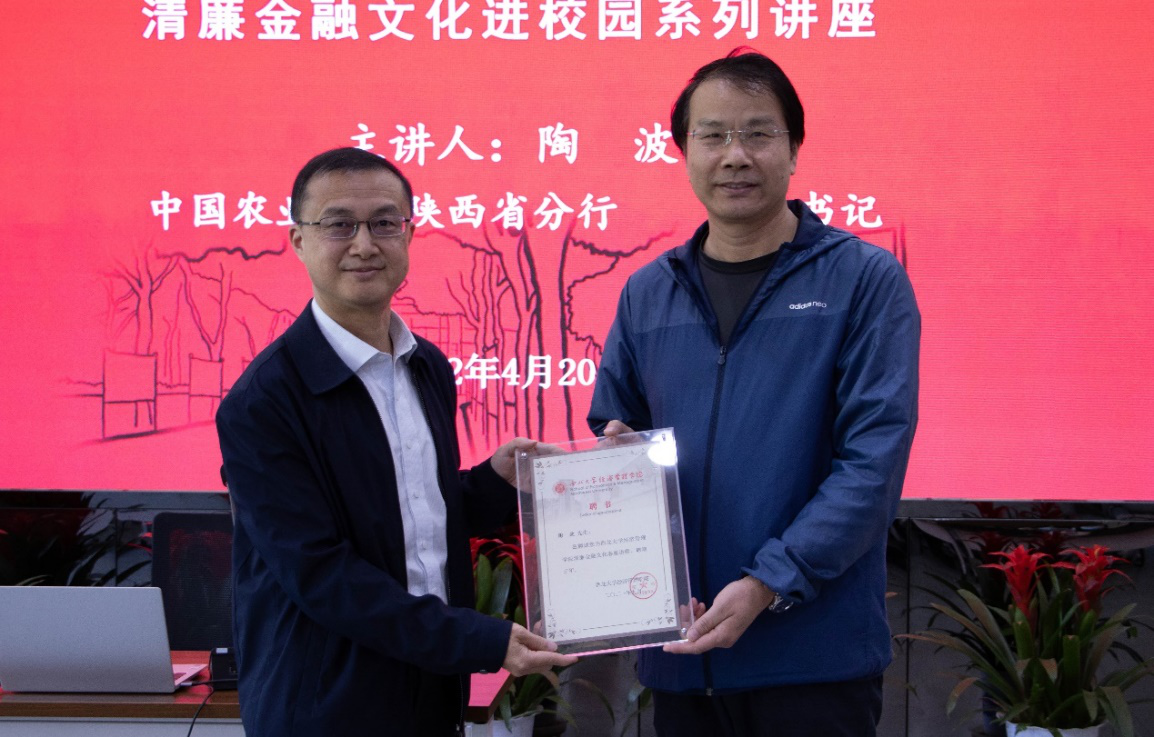 按照西北大学与陕西银保监局开展清廉金融文化共建活动的安排,4月20日,中国农业银行陕西省分行纪委书记陶波应邀到校,为776net必赢官网师生做了本学期清廉金融文化系列讲座的第二讲,题为《金融领域反腐形势与实践》。西北大学纪委副书记王康,陕西银保监局纪委办张津崇,776net必赢官网党委书记杜勇和学院40余名师生出席了本次活动。王康致辞,并为陶波颁发清廉金融文化客座讲师聘书,讲座由杜勇主持。