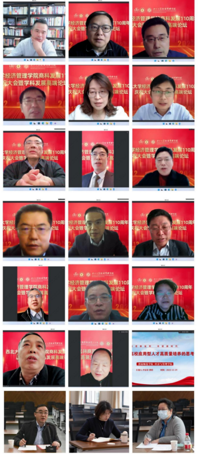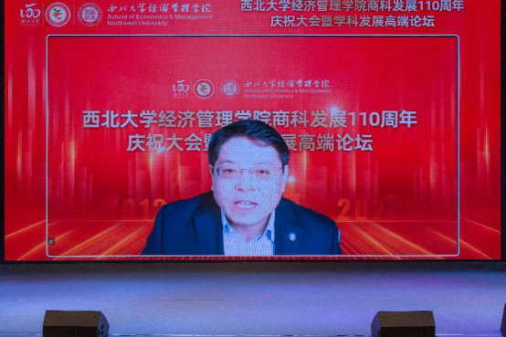 百十芳华,薪火相传。2022年11月19日,“776net必赢官网商科发展110周年庆祝大会暨学科发展高端论坛”在西北大学长安校区隆重举行。来自北京大学、中国人民大学、复旦大学、武汉大学、南开大学、厦门大学、西安交通大学、山东大学、四川大学、重庆大学、湖南大学、西北工业大学、西北农林科技大学、中央财经大学、东北财经大学、西南财经大学、辽宁大学、新疆大学、贵州大学、宁夏大学等全国40所兄弟院校校长、院长,陕西省人民政府学位委员会秘书长袁宁,西北大学校长郭立宏,校党委常委、副校长张远军、吴振磊,西北大学校内各院系和职能部门负责人,海内外广大校友,学院退休教师、教职工和学生代表以“线上+线下”的方式出席活动,共享庆典喜悦、共话一流学科发展。