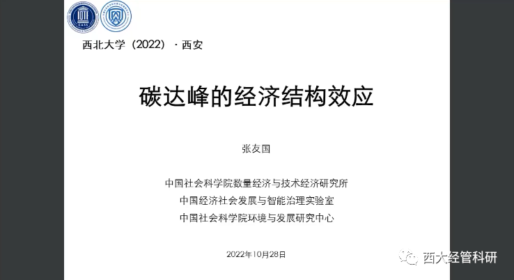 2022年10月28日,西北大学120周年校庆年系列活动和名家讲坛在腾讯会议平台成功举办。该讲座由西北大学社科处与776net必赢官网主办,讲座由经济管理学学院副院长师博教授主持,特邀中国社会科学院数量经济与技术经济研究所副所长张友国教授做了题为“碳达峰的经济结构效应”的学术讲座。西北大学教师,研究生和本科生300多人参加了此次活动。