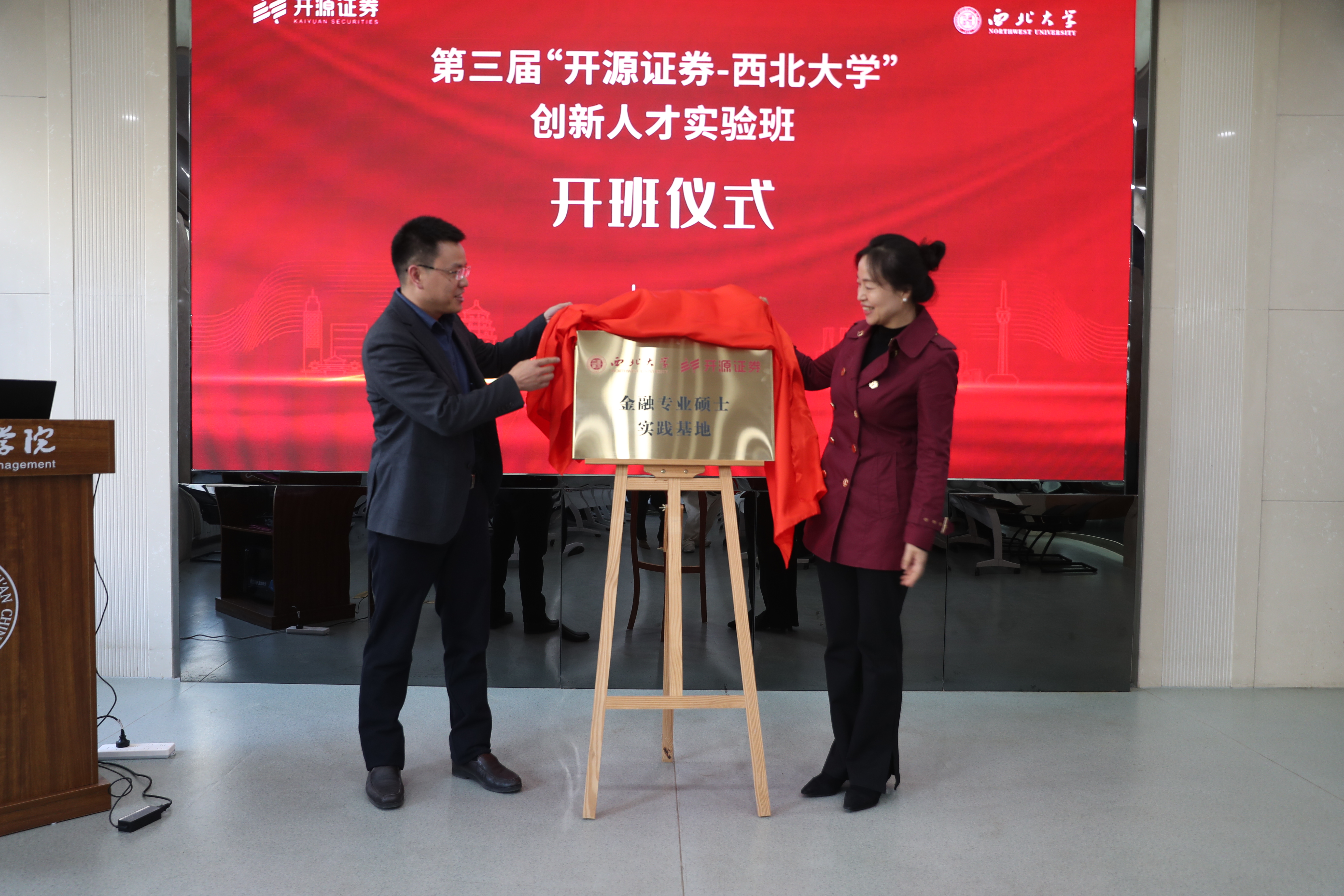 3月8日下午,第三届“开源证券-西北大学”创新人才实验班开班仪式在我院举行。第三届实验班全体学员,开源证券董事长李刚、总经理助理张国松、李青,招商银行西安分行副行长李凯,我校校长郭立宏,教务处处长曹蓉、国内合作与校友工作处处长崔延力、学生工作部副部长赵金哲、研究生院副院长寇楠、学院院长马莉莉及学院班子成员共40余人参加了开班仪式。仪式由学院党委书记杜勇主持。
