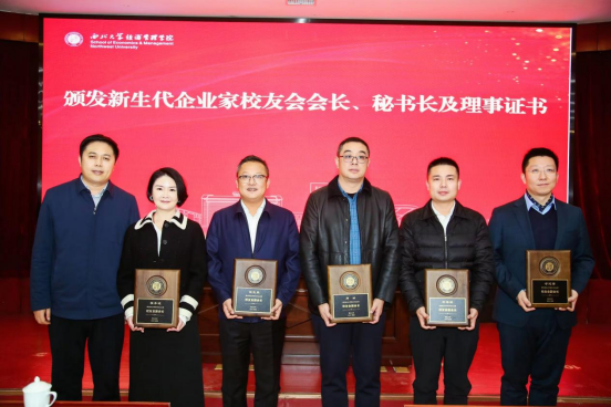 陕西江豪商业运营集团股份有限公司董事长王文礼代表研修班全体学员发言。他结合在校学习期间的点点滴滴和所感所获,表达了对母校深深的感激和眷恋之情。孙庆伟、张少纯逐一为研修班学员颁发结业证书并合影留念。崔延力为新生代企业家校友会颁发会长、秘书长及理事证书。