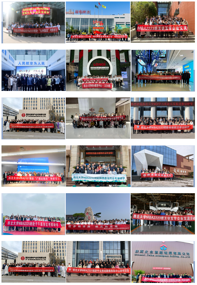 在企业参访和研学实践中,我们走进实际场景,感悟商业的深邃。2023年,组织MBA学员开展研学活动34次,走进优秀企业29家。西部机场、陕建集团、陕汽集团、陕鼓集团、隆基绿能、广联达、爱菊粮油、秦创原、龙钢公司、长安航空、盘龙药业、彩虹集团、石羊集团......每一次踏入企业大门,都是对理论知识的实际印证;每一次深入研学,都是对行业发展脉搏的触摸。这一年,我们在实践的征程中累积智慧,收获成长。