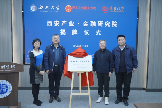 揭牌仪式上,杨勇、吴振磊、郭立宏和史雅茹分别代表西安市金融工作局、西北大学、西安产业·金融研究院和朱雀投资共同为“西安产业·金融研究院”揭牌。