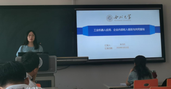 在讲座环节,王寿彭同学基于城市群区位、城市群发展水平等角度对国家级城市群建设推动省界毗邻县共同富裕展开分析,为不同省界毗邻县如何在构建区域发展新格局的背景下,立足于自身禀赋加快实现共同富裕提供了参考依据。朱闪闪同学从企业内部管理层和普通员工收入差距角度分析了工业机器人应用对企业收入差距的影响,并进一步考察了工业机器人应用对企业共同富裕的影响,为自动化技术影响共同富裕的研究提供了新的切入点。