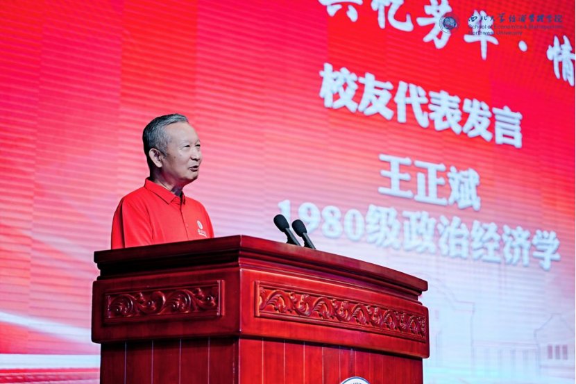 1980级政治经济学校友王正斌在发言中表达了对时代和机遇、学院和老师、同学和校友的三重感恩、感谢,他期待校友们牢记并践行“公诚勤朴”校训,继承学院“开放包容、求真务实、创新超越”的传统,发扬学院坚韧不拔的精神,做到“三好”:好心态、好身体、好行为。最后,他表达了对母校、母院、同学的衷心祝福。