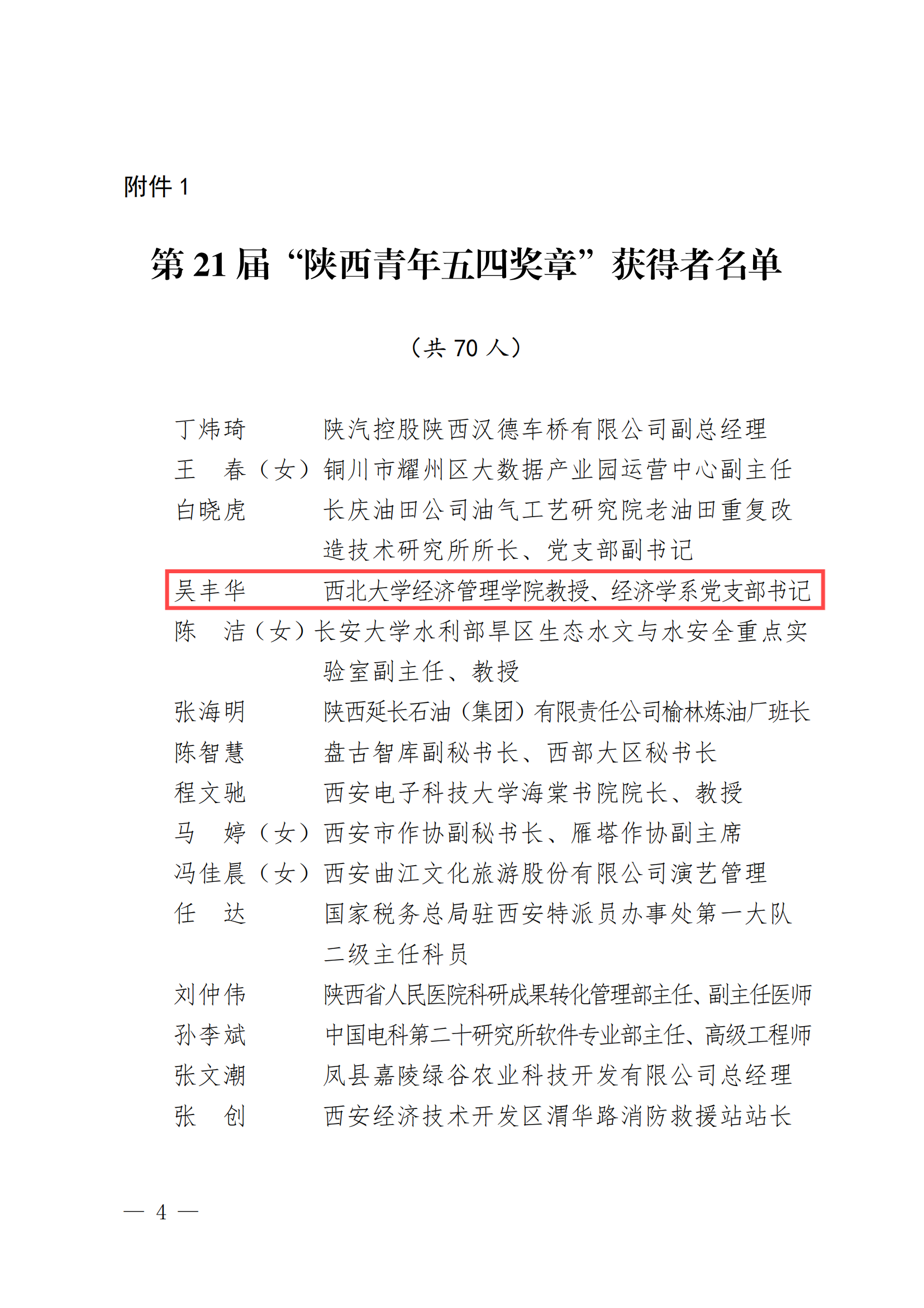 为集中展示新时代陕西青年的精神面貌和价值追求,奖励先进激励后进,以优异成绩迎接中华人民共和国成立 75 周年,共青团陕西省委、陕西省青年联合会作出了关于颁授第 21 届陕西青年五四奖章的决定。776net必赢官网教授、经济学系党支部书记吴丰华荣获第 21 届“陕西青年五四奖章”。