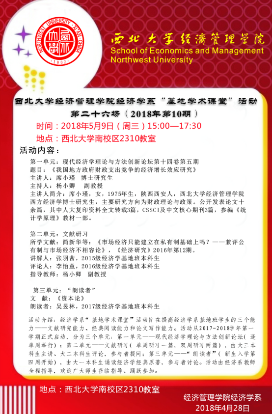 西北大学776net必赢官网经济学“基地学术课堂”活动第二十六场(2018年第10期)