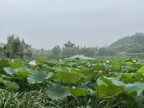 穿过彩虹滑道和户外拓展基地,调研团于桃花源牌楼东侧,进入大型赏莲景观区,荷叶繁茂、郁郁葱葱,荷花竞相开放。