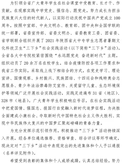 近日,中共陕西省委宣传部、中共陕西省委文明办、中共陕西省委教育工委、共青团陕西省委、陕西省学生联合会印发《关于2021年陕西省大中专学生志愿者暑期文化科技卫生“三下乡”社会实践活动先进集体、先进个人的通报》的文件中,由我院师生组成的西北大学“奋斗百年路 启航新征程 百村千户行”社会实践团荣获2021年陕西省大中专学生志愿者暑期文化科技卫生“三下乡”社会实践活动“省级标兵团队”荣誉称号。