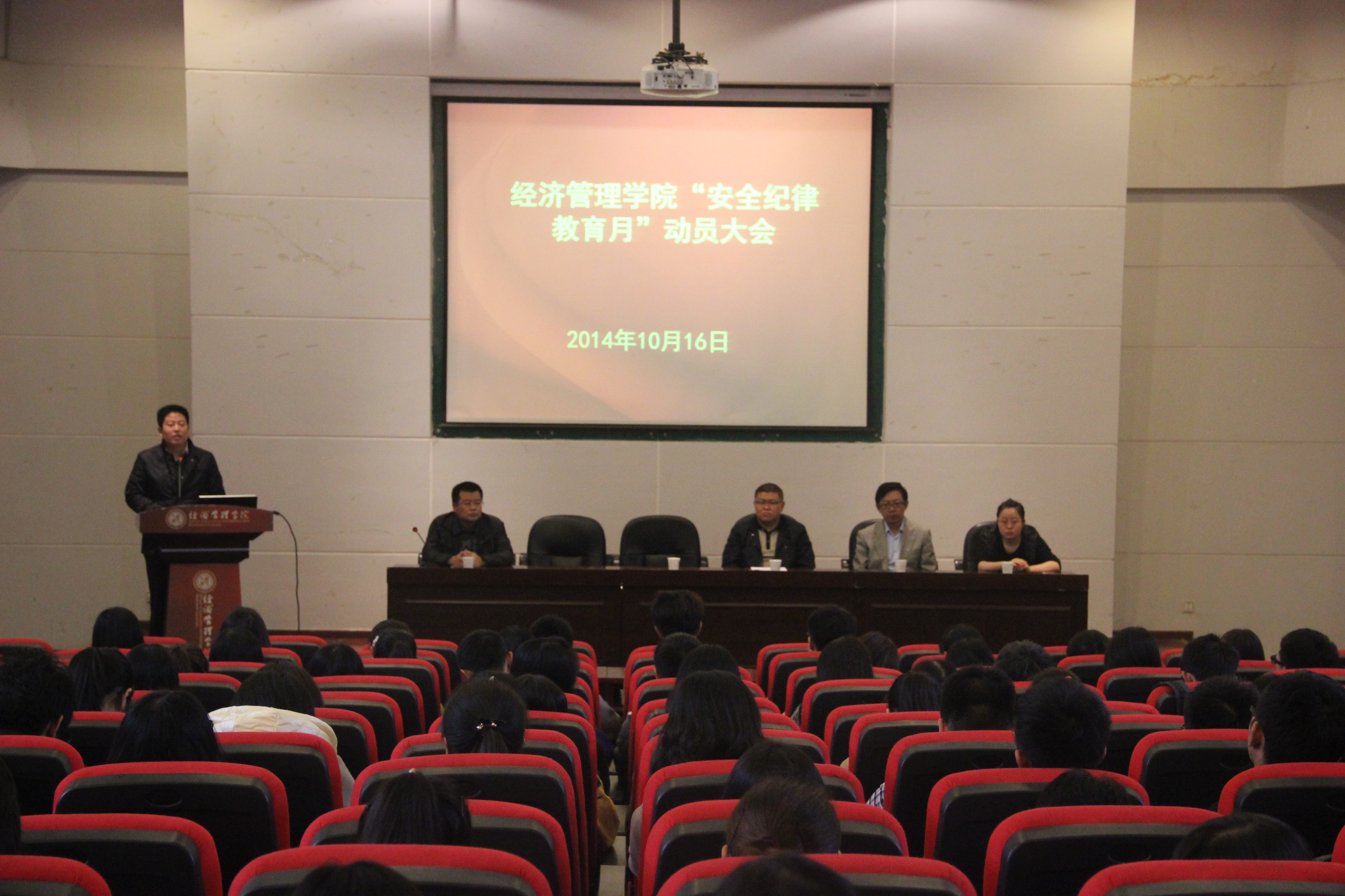 为了切实贯彻落实学校安全隐患排查整改工作精神,保证大学生群体的稳定安全,强化大学生安全意识,增强纪律观念和心理调适能力,提高学生综合素质,院学生工作领导小组研究决定于2014年10月中旬至11月中旬在全院学生中开展“安全纪律教育月”活动。10月16日下午,“安全纪律教育月”动员大会在金海报告厅举行。院学生工作负责人、公安处治安科干部、院学生工作干部和全院学生干部260余人参加了会议。