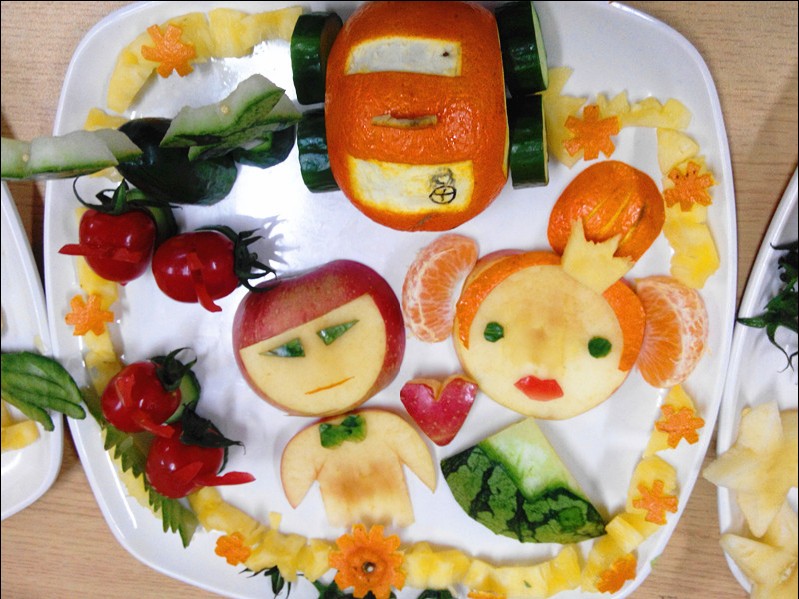 活动还没开始,比赛现场已是人潮涌动,有的团队忙于擦拭器具,有的团队静坐构思作品,各组都信心满满、跃跃欲试。主持人宣布比赛规则和评分细则后,给选手们分发水果、水果刀以及精美的水果盘。在宣布比赛开始后,现场气氛顿时活跃起来,选手们开始了有条不紊的制作。有的参赛团队自备了很多其他的水果,有的选手把苹果皮削成了条状,编出各种各样的形状出来,有的团队把香蕉做成了海豚的样子,有的把橙子削成了可爱的娃娃脸。经过创意和精细雕琢,一盘盘色彩艳丽、造型别致的水果拼盘呈现在大家面前,选手们出奇的制作让大家赞不绝口。最后的评比环节在作品造型基础上,还加了介绍与取名环节,在比巧手之余,也考验着选手们的智慧与临场反应。
