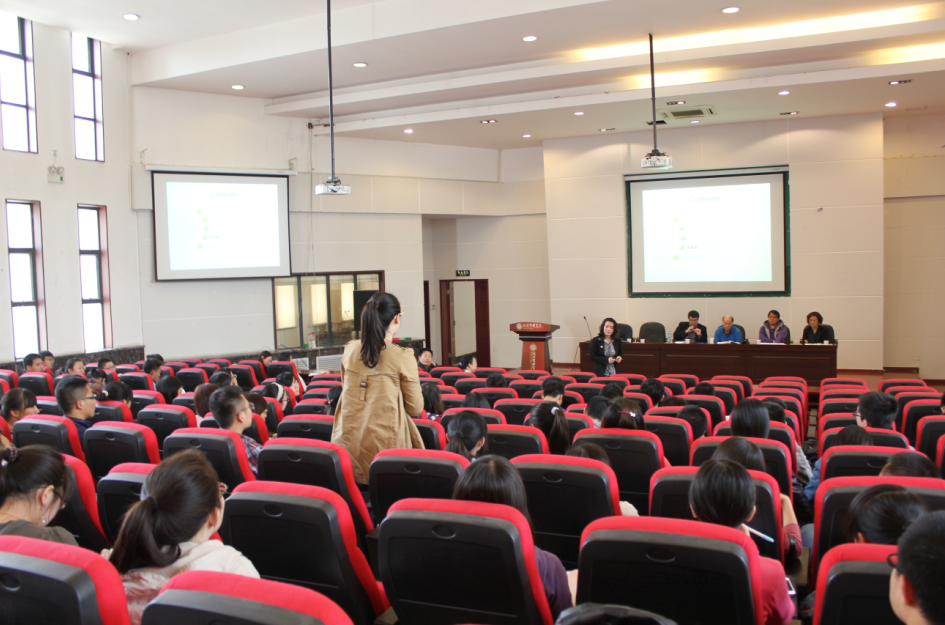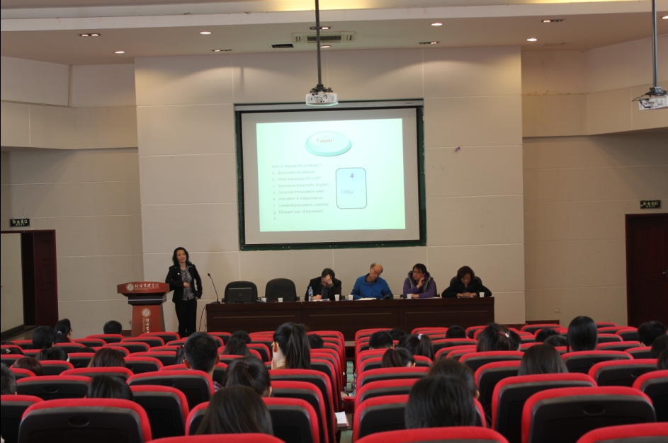 4月24日下午3点30分,“学问与人生”大学生素质教育系列讲座(第七讲)在南校区金海恒业报告厅举行。我校国际交流与合作处副处长任惠莲副教授、法语联盟西安法语培训中心刘莉老师携三名外籍教师为我院师生作了题为《拓展国际视野,树立世界眼光》的公派留学项目经管学院宣讲会,近200名师生聆听了讲座,讲座由776net必赢官网学生工作负责人主持。