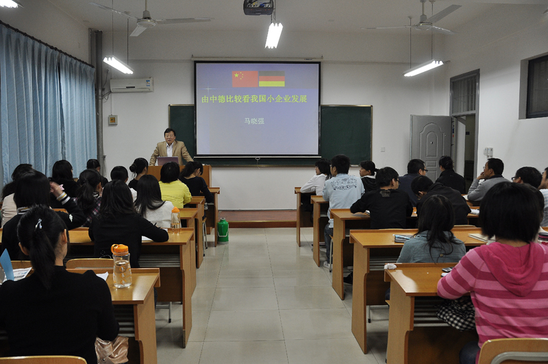 10月22日晚,我院马晓强副教授应邀在8213教室作了题为《由中德比较看我国中小企业发展》的专题报告。报告会由院团委马金保老师主持,09级硕士研究生参加了报告会。