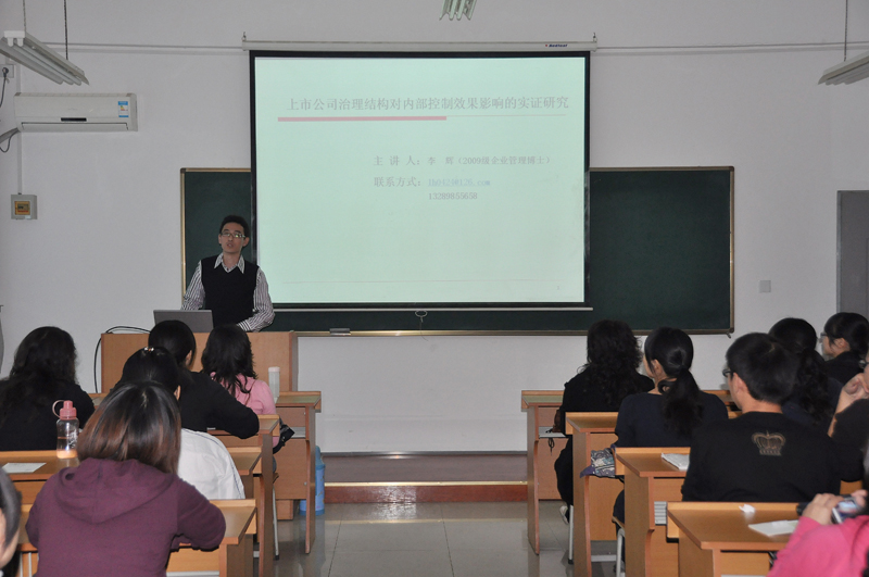 10月23日下午,我院2009级企业管理专业李辉博士在8213教室作了题为《上市公司治理结构对内部控制效果影响的实证分析》的学术论文报告。报告会由院团委马金保老师主持,2009级硕士研究生参加了报告会。