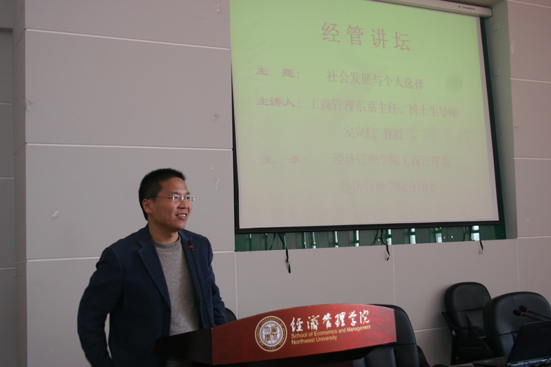 2008年11月19日,工商管理系主任、博士生导师安立仁教授应邀在金海报告厅为学生作了题为“社会发展与个人选择”专题报告会。报告会由学院党总支副书记樊涛老师主持。行政副院长严汉平教授出席了报告会。学院各类学生共200多人参加了报告会。
