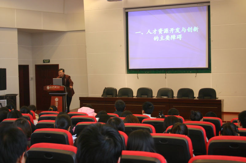 惠教授首先从观念冲突、文化冲突、机制冲突等方面的深入分析了党政管理人才、经营管理人才、专业技术人才创新的发展现状和存在的主要障碍。接着又从资本理论的演化过程,告诉同学们人才资源是第一资源。最后,惠老师给出了人才资源开发与创新的对策建议。惠老师的报告深入浅出、用生动的事例向同学们阐述了增强人力资本、增加人力资源的紧迫性和重要性。并希望同学们能够在大学时光里努力学习,充实自己,提高自身资本的积累,为将来打好基础。报告会后,惠老师又为同学们所关心的就业与考研之间的选择和频繁跳槽所带来的影响等问题。给出了建议和意见。