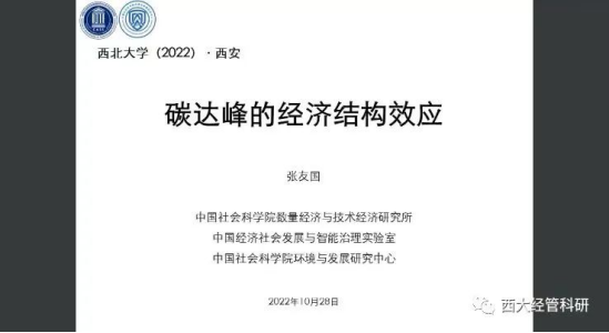 10月28日,中国社会科学院数量经济与技术经济研究所副所长张友国教授做了题为《碳达峰的经济结构效应》的学术讲座。他结合二十大精神和中国绿色发展的实际,从中国式现代化是人与自然和谐共生的现代化的视角强调了碳达峰的重要性,并介绍了中国的碳治理体系,指出中国未来碳治理体系逐步转向碳排放治理和强度“双控”制度。在此基础上,介绍了碳减排与经济结构变化之间的研究,指出碳减排经济结构影响研究领域仍存在较大拓展空间。张教授分析了碳达峰的经济结构影响机制包括:局部均衡效应,一般均衡效应和不确定性;并从模拟的角度介绍碳达峰是怎么影响经济结构,模型和情景的设计;最后,基于实验结果,介绍了其研究的结论:理论上碳达峰对经济结构变化的影响具有不确定性;碳达峰有利于优化居民消费和出口产品结构,但可能抑制消费比重和总需求中服务份额上升;碳达峰的需求结构效应、产业结构效应和能源结构效应之间可能存在不协调性;碳达峰影响经济结构变化的同时,也会影响经济总量变化。