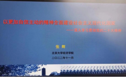 11月1日,北京大学张辉教授做了题为《以更加自信主动的精神全面建设社会主义现代化国家——深入学习贯彻党的二十大精神》的学术讲座。他从“一以贯之的主题:实现社会主义现代化”、“坚持历史自信:坚定不移地走中国式现代化道路”、“增强历史主动:在加快构建新发展格局中把握发展主动权”等三个方面对党的二十大精神进行了解读。他讲到,中国式现代化不仅是中华民族实现伟大复兴的必由之路,它更打破了“西方中心主义”教条。构建新发展格局就是要立足规模化优势,将我国经济发展的立足点由国际转向国内,通过超大规模的国内市场促进自身核心技术的创新、工艺的提升、品牌的形成,通过生产革新创造、引领、满足更多新层次、宽领域的美好生活需求,从而推动实现高质量发展。