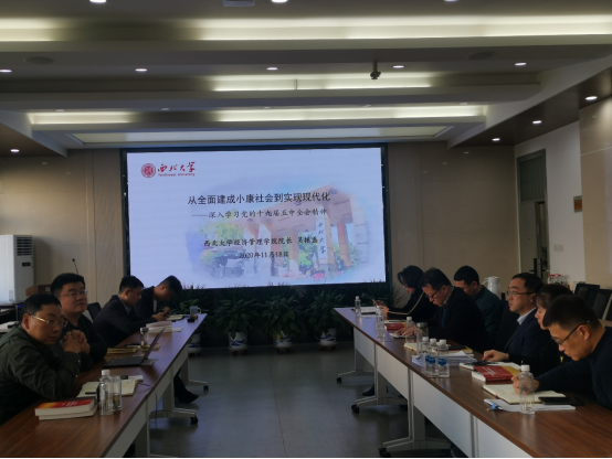 会上,院长吴振磊教授作了题为《从全面建成小康社会到实现现代化》的十九届五中全会精神学习报告,报告从五年规划与“十四五”规划、“十四五”规划的时代背景、规划建议的核心要义、2035年远景目标、“十四五”规划的建议:指导思想、原则、主要目标与重点任务、以及《建议》聚焦重大问题等六个方面出发,对中国共产党第十九届五中全会公报、《中共中央关于制定国民经济和社会发展第十四个五年规划和二〇三五年远景目标的建议》进行了全面的、深入的解读。